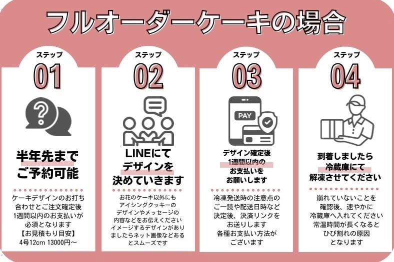 【商品の詳細】 甘さ控えめな国産黒糖スポンジケーキにふわっと軽めのチーズクリームのお花をのせました 花好きな方や大切な人への贈り物にぴったり 贈り物としても素敵な演出ができますので 記念日のご注文であれば 箱を開ける瞬間のご表情をカメラに納めること オススメです ーーーーーーーーーーーーーーーーーー 天然色素を使用しますので 人工的な食紅とは違った優しい色合いが表現でき 自然な材料を取り入れている方への贈り物としても 喜ばれております “天然色素”とは、 自然由来の食紅で以下のようなものがあります かぼちゃ→黄色 にんじん→オレンジ 抹茶、ほうれん草、小松菜→緑 ココア、ブラックココア→茶色、こげ茶 バタフライピー、スピルリナ→青 紫芋、ブルーベリー→紫 ドラゴンフルーツ、紅麹→赤ピンク ※こちらは一例です ※それぞれ味がありますことをご了承の上ご注文ください ※色の指定はできますが素材の指定をご希望の場合はフルオーダーケーキをお選びください(4号12cm13000円〜) トラブル防止のため、画像でのご指定など、色以外のリクエストはお控えくださいますようお願いいたします。 ーーーーーーーーーーーーーーーーーー [5号サイズ箱] 外寸:W197×D203×H83mm 【原材料】 [スポンジケーキ]バター、国産黒糖、鶏卵、牛乳、小麦粉 [チーズクリーム] クリームチーズ、生クリーム、ゼラチン、砂糖、各種天然色素 【解凍方法】到着後速やかに冷蔵庫へ 3〜4時間かけてゆっくり解凍してください 【保存方法】解凍後は要冷蔵 【賞味期限】お渡し日入れて3日以内 ナマモノですのでお早めにお召し上がりください ※冷凍状態で2週間 ↓↓ご一読ください↓↓ 【冷凍発送の注意点】 万全な準備のもと冷凍発送させていただいておりますが、繊細なデコレーションのため配送時の破損は基本的に補償対象外となります (欠けていた、崩れていた、花びらが取れた、生クリームが箱に付いているなど) ✳︎店舗受け取りご希望の場合、 ✳︎特注(規格外)のご注文は、 LINEアカウントへご連絡ください 【配送遅延について】 天候不良による配送遅延の可能性があります 対策としてご入用の数日前に配送日をご指定くださることをおすすめしております よろしくご検討のほどお願いいたします 【備考欄へご記入ください】 ・カードに印刷する一言メッセージ ・黒糖が苦手な場合、白砂糖へ変更ができます ・領収書ご希望の方へPDFにてメール送信いたします ※備考欄が未記入でもok 当店おまかせでお作りします