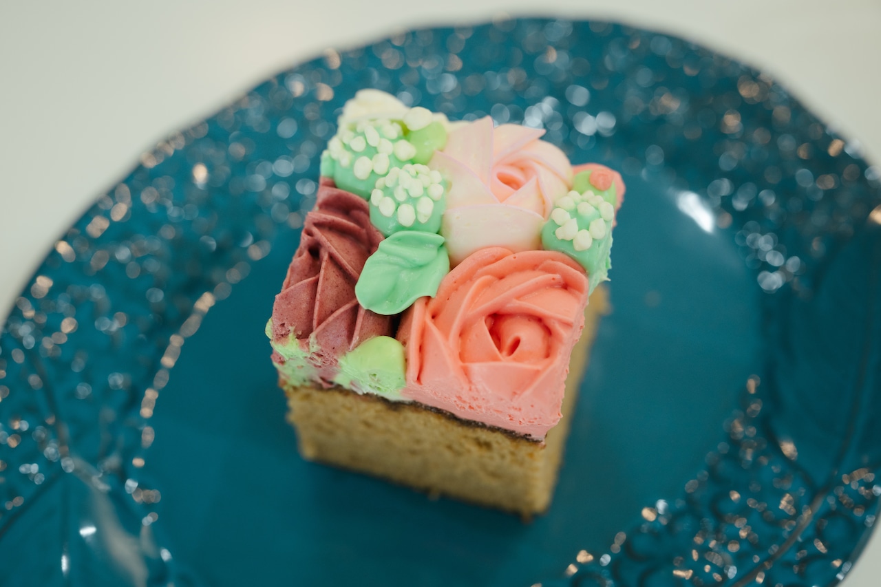 甘さ控えめな国産黒糖スポンジケーキ(スクエア型)にふわっと軽めのチーズクリームのお花をのせました